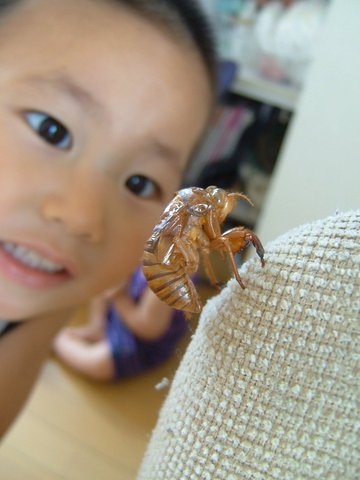 道ばたに落ちてたセミの抜け殻を持ってきてみました。そんな顔せんでも、動きゃしないって。