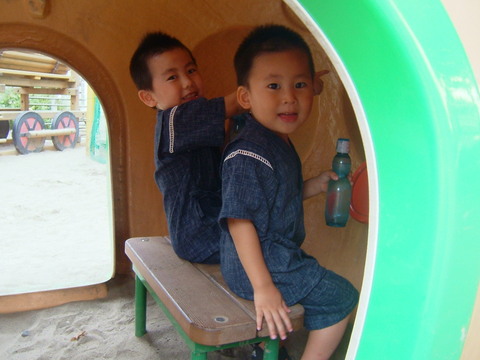 園庭にあるアンパンマン号に乗ってラムネ♪