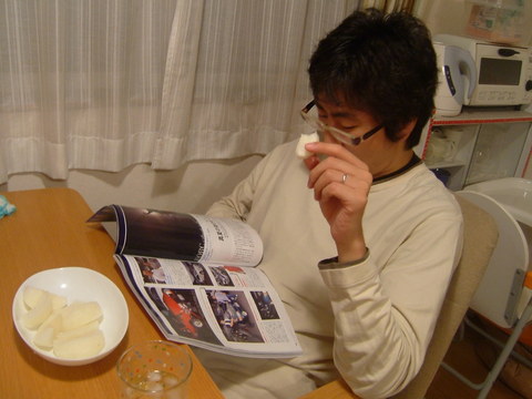 いただいた梨を味わいつつ、久しぶりにクルマの雑誌などパラパラ。真吾の至福のひととき☆