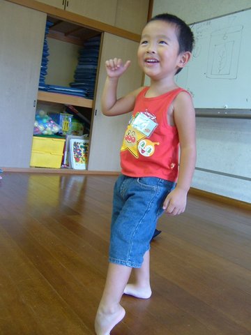 8-9月のお誕生会もやりました。誕生月のたいちゃんの得意ポーズ♪足がいいでしょ。