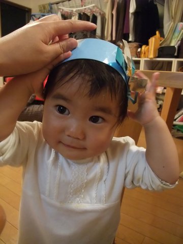 空が運動会で使ったヘアバンド。持って帰ってきたので宝が試着。