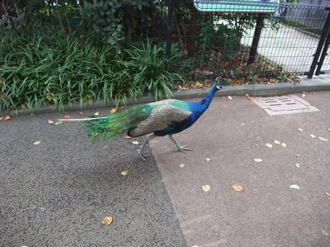 くじゃくは放し飼い。お散歩中のところに出くわしました。