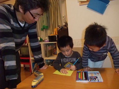 騒ぐと宝の風邪に触る、というので手作り絵本を作ってます。