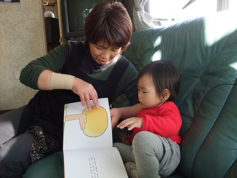 るっくんのばーばを独り占めして絵本読んでもらってます。