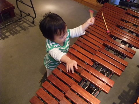 空のマネして木琴に挑戦の宝。願わくは右上のバチの柄を折ったのがうちの子じゃあありませんように。。