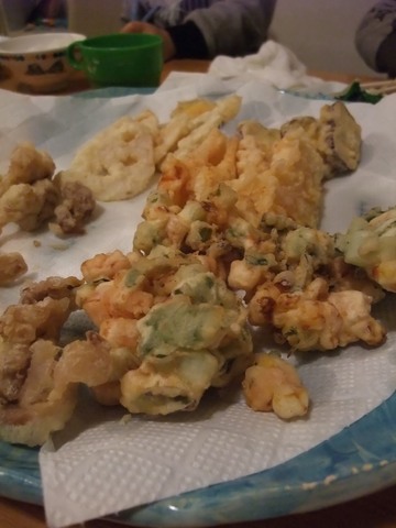 「葉っぱは天ぷらにするとさくさくでおいしいよ♪」ってちえ先生が言ってたよ、ということで葉はかき揚げに。