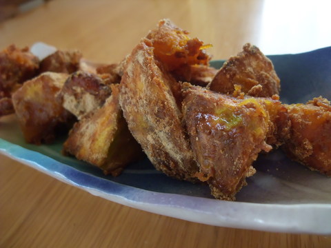 宮城からきた白いカボチャがめちゃ甘なので、揚げて黒蜜&きなこで和菓子風にしてみました。うまし。