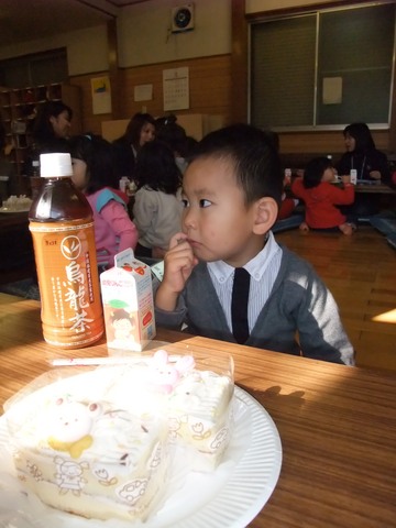 ケーキとジュースを前にしばしおあずけ。みんな揃ってごあいさつするまでちょっと待っててね。