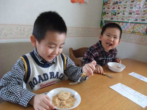 今日は幼稚園で餅つき大会だったそうで、食べきれない分をおみやに。おやつはきな粉餅です。