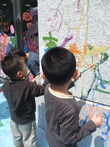 壁もガラスも描き放題。今回初めて参加の空と凪はおそるおそる。