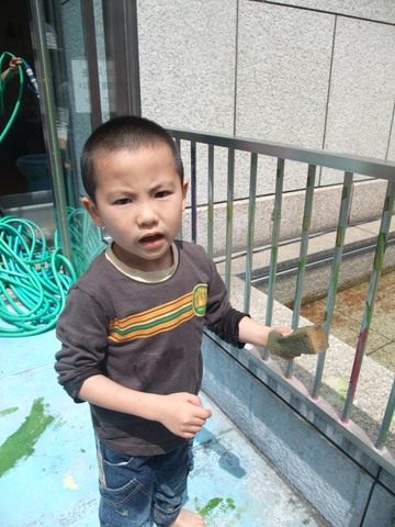 掃除も子供たちで。スポンジでこすった後、スタッフの方が水で大胆に流します。空は何故か怒ってますが。