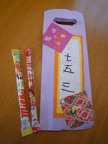 空が幼稚園で千歳飴をもらってきました。袋も自作なんですって。漢字も教えてもらって自分で書いたそうです。