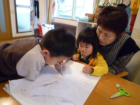 空が幼稚園の間、宝と凪はばーばにべったり工作タイム。お母さん、ありがとう。