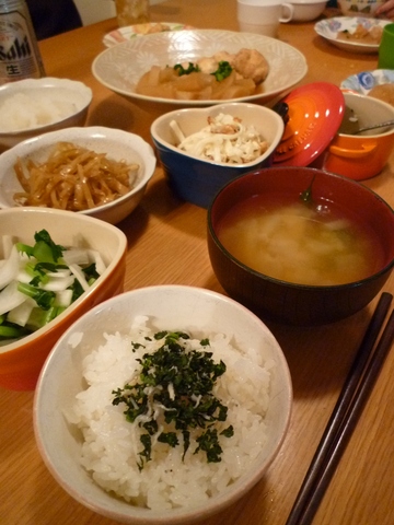 鶏団子と大根の煮物、皮のきんぴら、サラダ、浅漬け、ふりかけ、味噌汁、大根おろし。どれもこれも美味しゅうございました。