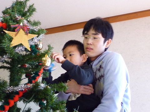 180cmくらいのツリーなもんで、上のほうはこうしてお兄さんに抱っこしなくては無理なのです。