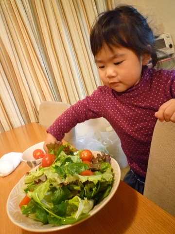 台所にステップ持ってきて「たからもやるー」ってお手伝いしたがる宝さん。今日はサラダの盛りつけ担当。