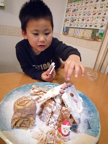 自分たちでお菓子を飾って「お菓子の家」を作っちゃおう、というケーキにしたのです♪