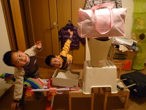 大作、戦隊ロボ。(ピンクのカバンが頭、首、胴、ときて、椅子が足、両脇が腕)やられてうわー、のポーズ。