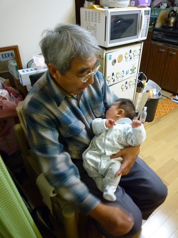 ムズかる新に困り気味のおじいちゃん。今日は新の内祝いを届けに来たのでした。