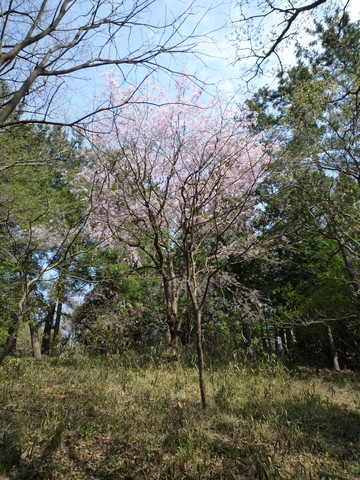 先ほどの根っこ登りした崖の上には1本だけ満開の桜がありました。