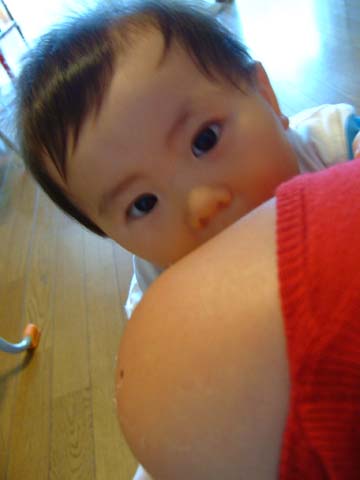 このところ、おんぶ(というか背中でつかまり立ち)がお気に入りで、トモコが座るとすぐやってきてこのとおり。