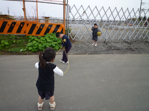 サッカーしたーい、と外へ。道路工事のためにここの一角が完全に遮断されて、絶対クルマが来ないんです。すごくいい場所。