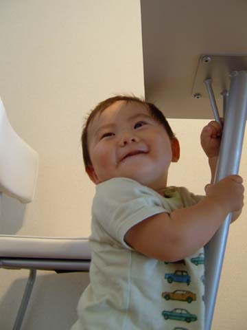 机の脚につかまり立ちして大満足☆
