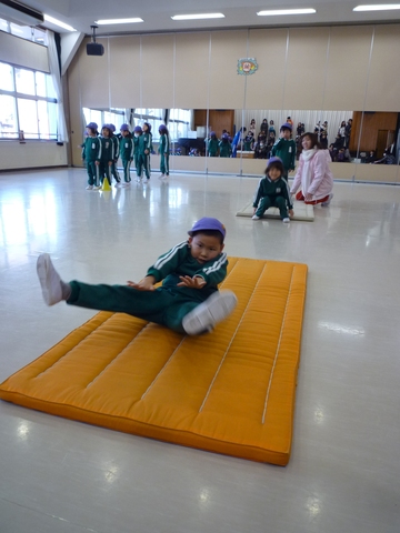 前転、上手です。回った後、べたっと寝っ転がっちゃう子が多い中、凪は起き上がってきました。さすが凪!
