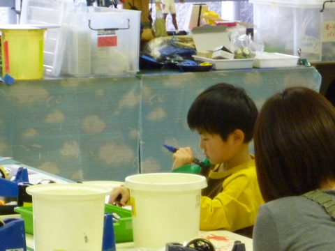 大張り切りで工作中。輪ゴムの反動でボールが飛び出すおもちゃを作ってるらしい。真剣です。