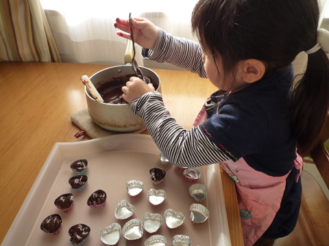 包丁でチョコ刻む&生クリームを火にかけて温める、というのはもちろんトモコが手伝うんですが、それ以外はこうしてがんばって作ったんです。
