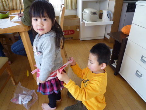 凪にプリキュアの服を着付けてもらってます。しょうがないよ、父さんいま本気だからさ。