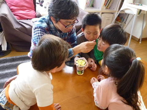 家に帰っておやつタイム。アイスに群がるうちのヒナたち。口の大きい順に入れてもらえるんだぞ。