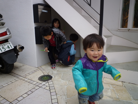 きたけど、入り口脇の階段の下を基地にして遊び始めちゃった。