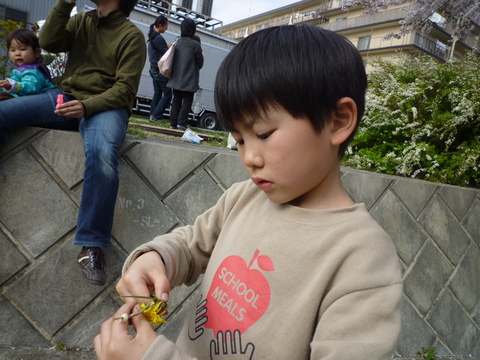 タンポポをモーターに、野蒜を燃料タンクに見立てて、棒に結びつけて川に流すんだそうです。