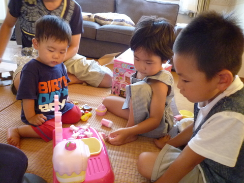 宝のリクエストでプリキュアのキッチンセットを。異常に真剣なギャラリーが2名w