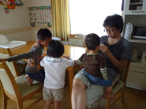 父さんに群がる子供たち。こういう場面で空はひとり別の活動することが増えてきました。これも成長、なのかな。