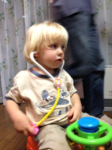 聴診器かけてバスで出動です!
