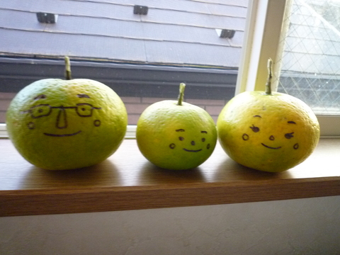 さきさんとこで拾ってきた夏みかん、新が並べてたのでお顔描いてみた。