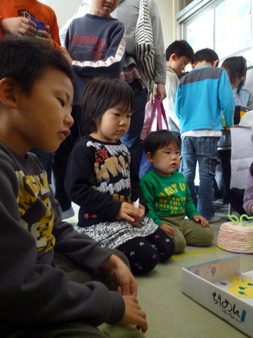 その後も、次々に見知ってる子のところへ行って遊ばせてもらう子供たち。一人ずつ遊びが違うから説明を真剣に聞いてます。