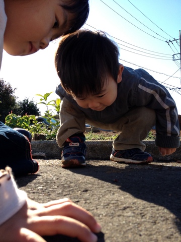 ひなたぼっこしに出てきたテントウムシを見つけて大興奮。のめりそうな勢いで観察中。