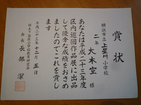 空が以前出品した硬筆の作品で賞状をいただいてきました。がんばってよかったね。