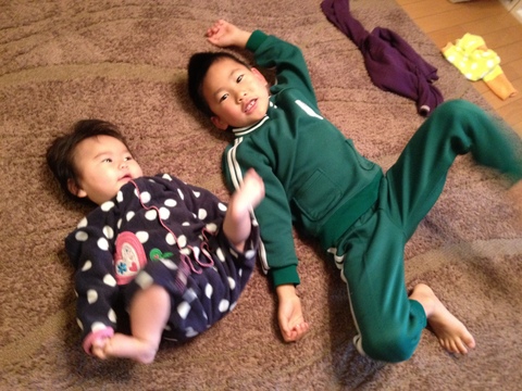 朝から同じポーズして遊んでます。おーい。早く支度してしまいなさーい!