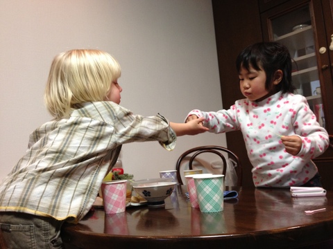 遊びに疲れて咽が渇いた2人はフルーツタイム。どーぞどーぞしてもらってます。