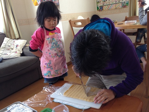 おかしの家作り。今年はクッキーで作ります。校長先生に見守られながらw真吾が懸命の型抜き。