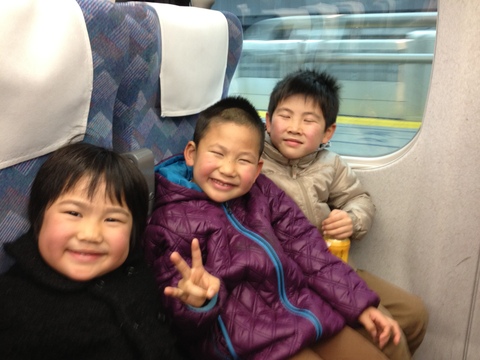 東京でゆうから引き取って新横浜までは親子旅。なんか雲行きの怪しげな顔が2つ。。