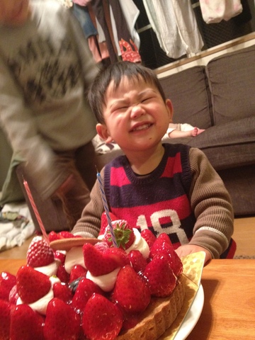 兄姉さんズに手伝ってもらってやっと消せたろうそく。こぼれそうなイチゴと新のいい顔!