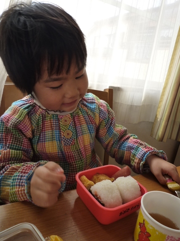 午前中の製作に引き続き、お昼はお弁当。おにぎりと卵焼きとウインナー。どれから食べようかな?