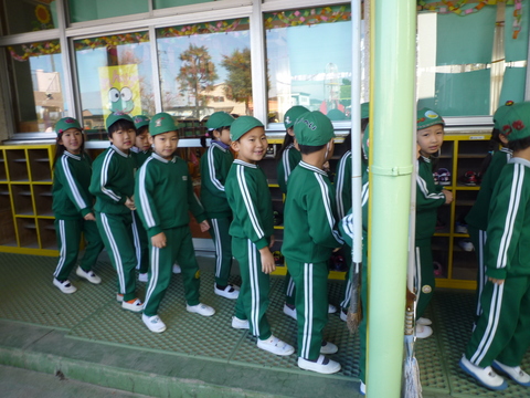 今日は幼稚園の体操参観。これからホールに向かうところ。