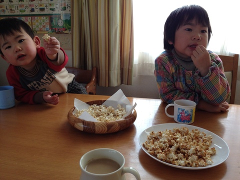 幼稚園で緊張した後は、大好きなポップコーンでおやつタイム。ほけ〜っとなってるのがかわいい♪