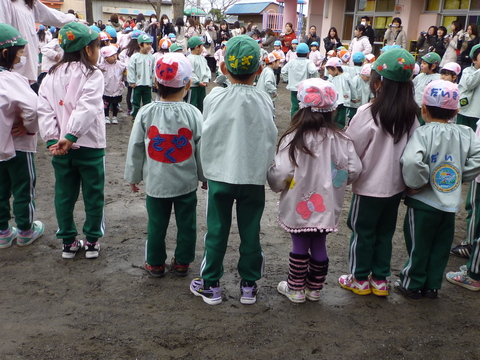 朝の体操は小雪舞う外で。ペアになってる年少さんからするとだいぶ大きな凪の背中。
